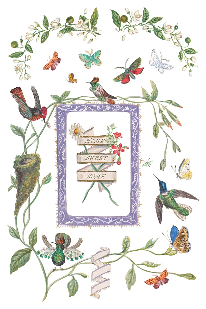 Et pour ce transfert, IOD a choisi une palette de couleurs particulièrement tendres et délicates. Ainsi, des bleus, des roses, des parmes, des verts se déclinent et s’harmonisent les uns avec les autres pour donner vie à de romantiques motifs de fleurs diverses et d’animaux comme, entre autres, des papillons, des colibris mais aussi de jolis petits chats.