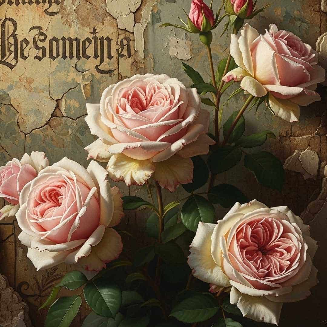 Ce design comporte tous les éléments du romantisme, de magnifiques roses aux pétales parfaits, des dégradations causées par le passage du temps, la vieillesse et l’usure ainsi que de douces teintes tout en harmonie avec les couleurs de rose et de crème des roses.