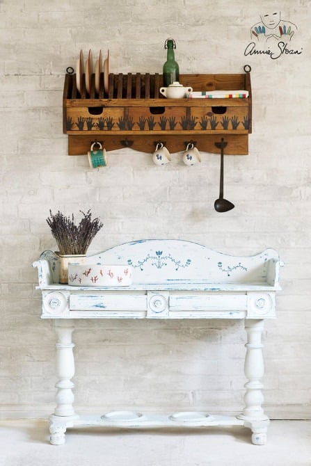 Vous pouvez utiliser la peinture Annie Sloan, Dixie Belle ou tout autre peinture, des cires décor métallisées, des crayons à l’huile,…
