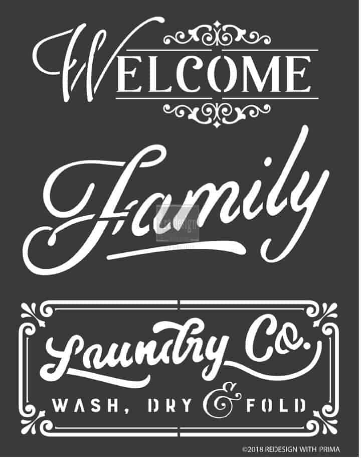 Le pochoir Home Accents de Redesign vous offre des écritures en anglais : Welcome (Bienvenue), Family (Famille) et une étiquette Laundry (Lessive).