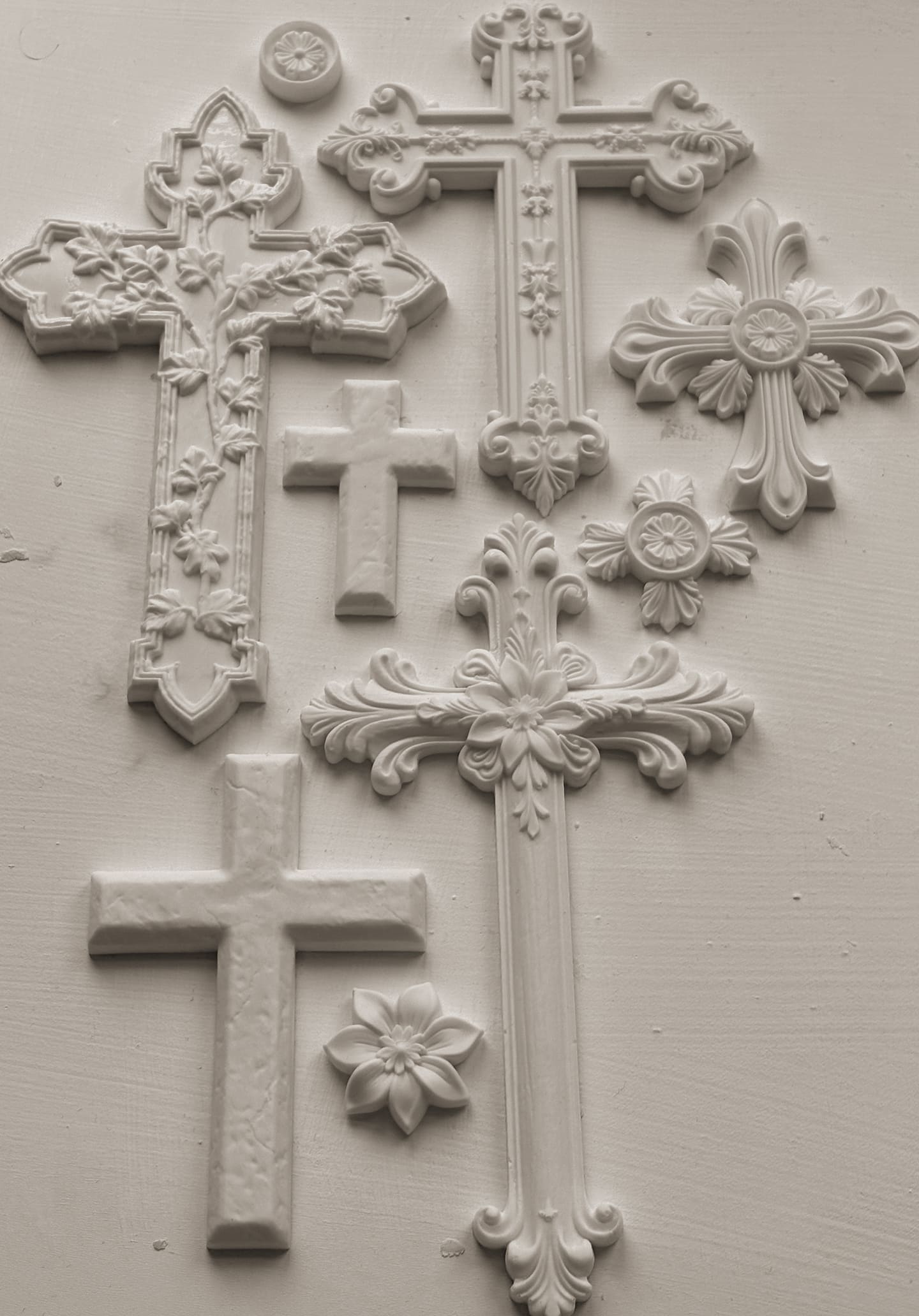 Les Croix est un moule en silicone de grande qualité présentant diverses empreintes de croix richement décorées qui attendent de prendre place dans vos projets créatifs.
