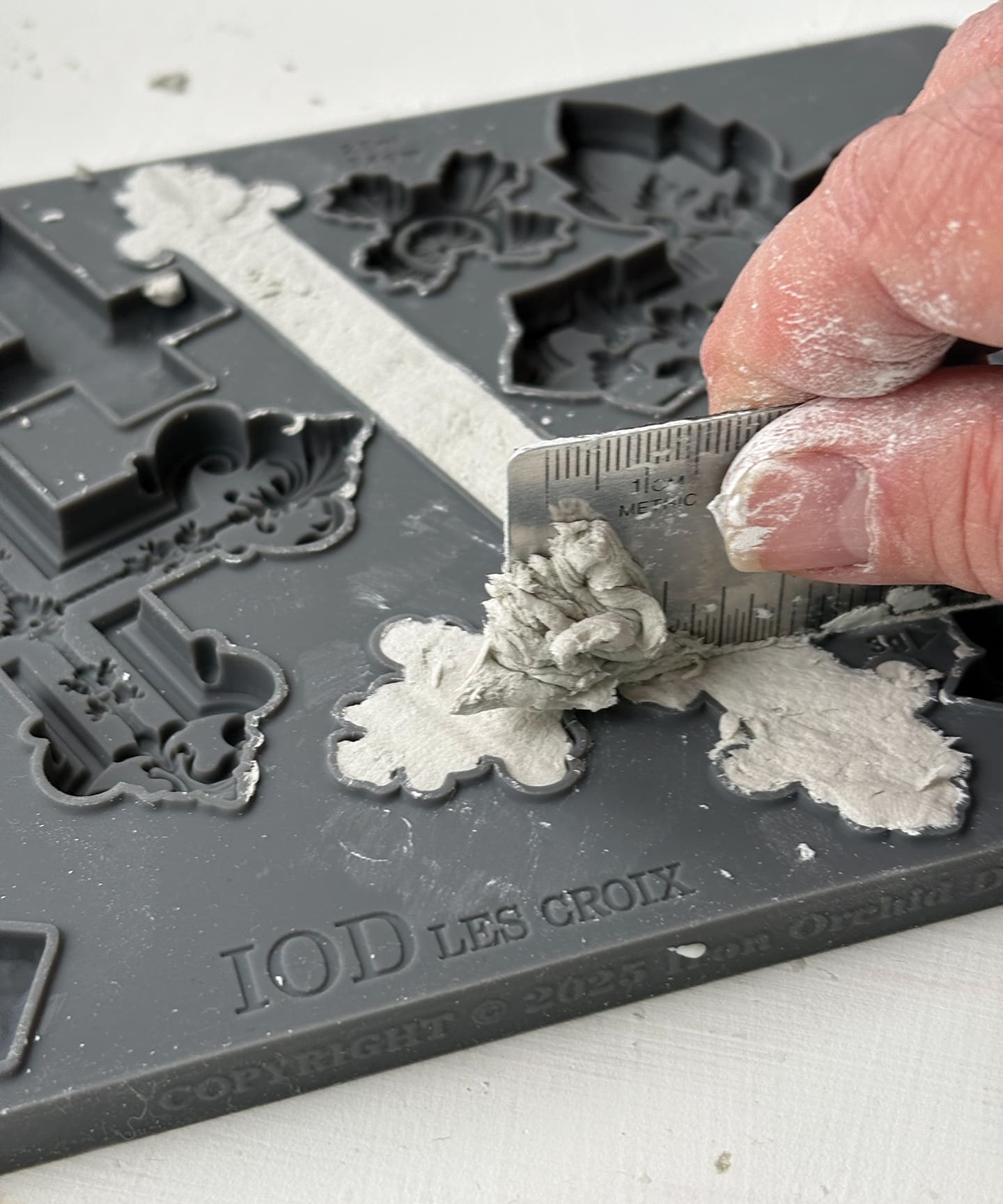 Avec la pâte auto-durcissante avec séchage à l’air libre, remplissez bien votre moule et appuyez bien pour combler chaque détail. Aidez-vous pour cette opération d’un brayer. Arasez ensuite votre moule, avec une spatule, et démoulez-le, il n’est pas nécessaire d’attendre que la pâte soit sèche. Ainsi votre moulure garde une certaine souplesse qui vous permet plus de possibilités dans la mise en œuvre de vos décors.