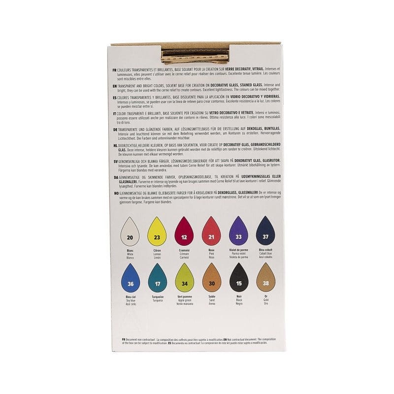 Chacun des flacons du coffret contient 20 ml de Peinture Vitrail.