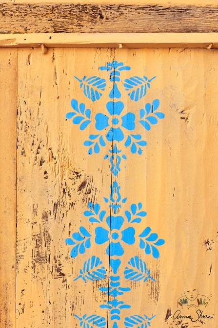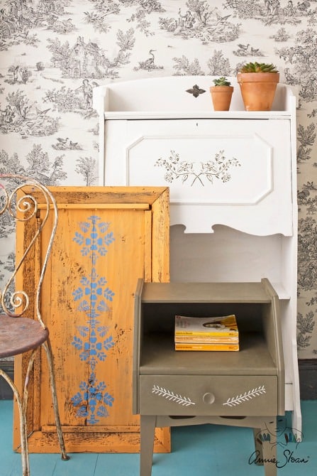 Vous pouvez utiliser la peinture Annie Sloan, Dixie Belle ou tout autre peinture, des cires décor métallisées, des crayons à l’huile,…