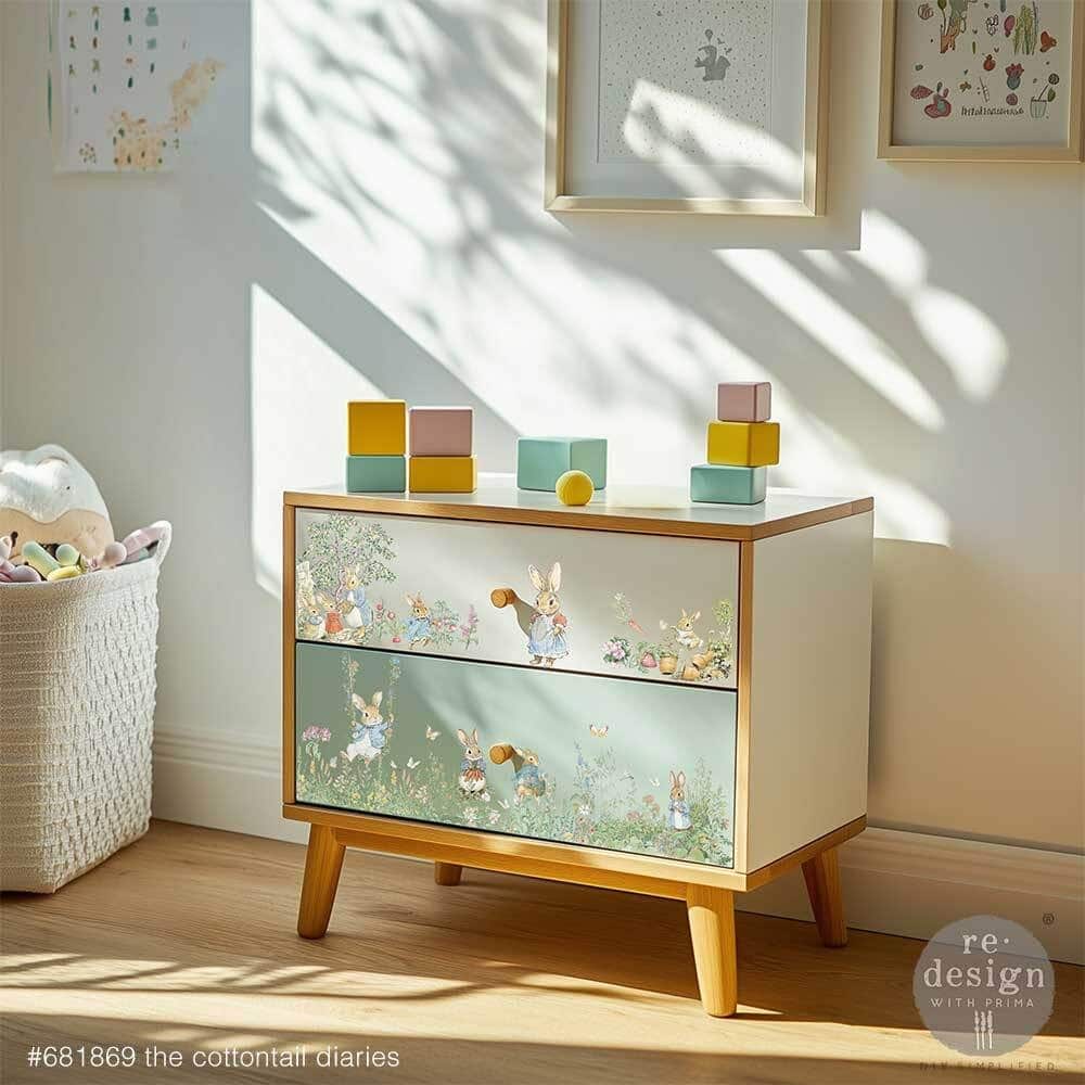 Le décor transfert Middy The Cottontail Diaries de Redesign with Prima et ses divers motifs sont inspirés des personnages d’un livre pour enfant de Beatrix Potter.