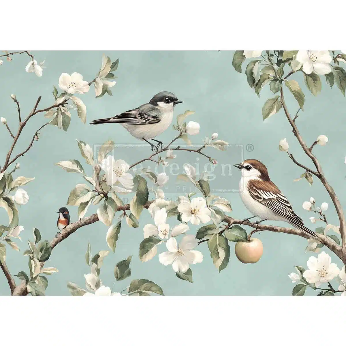 Whispering Wings présente une charmante composition sereine d’oiseaux chanteurs perchés parmi des branches fleuries et un feuillage délicat.